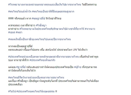 แพทย์รพ.ชายแดน ฝากถึง นักข่าวดัง "ฐาปนีย์หมอมีอะไรจะบอกคุณ" ระบุหากรักประเทศไทยจริง ควรนำเสนอข่าว โรงพยาบาลในประเทศไทย ใช้งบจากภาษีประชาชนมากมายรักษาคนไข้ต่างชาติที่ยากไร้จากประเทศเพื่อนบ้าน มากกว่าเสนอมุมไทยไม่ให้โรฮิงญาเข้าประเทศ ลบคำโจมตีจากนานาชาติว่าไทยแล้งน้ำใจ