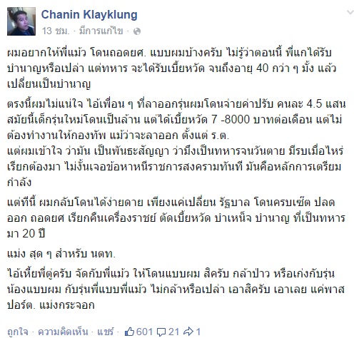 ผมอยากให้พี่แม้วโดนถอดยศแบบผมบ้างครับ ไม่รู้ว่าตอนนี้พี่แกได้รับบำนาญหรือเปล่า แต่ทหารจะได้รับเบี้ยหวัด จนถึงอายุ 40 กว่า ๆ มั้ง แล้วเปลี่ยนเป็นบำนาญ ตรงนี้ผมไม่แน่ใจ ไอ้เพื่อน ๆ ที่ลาออกรุ่นผมโดนจ่ายค่าปรับ คนละ 4.5 แสน สมัยนี้เด็กรุ่นใหม่โดนเป็นล้าน แต่ได้เบี้ยหวัด 7,000-8,000 บาท ต่อเดือน แต่ไม่ต้องทำงานให้กองทัพ แม้ว่าจะลาออกตั้งแต่ ร.ต.
