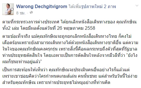 วันที่ 28 พฤษภาคม 2558 ผู้สื่อข่าวรายงานว่า นายแพทย์วรงค์ เดชกิจวิกรม อดีต ส.ส. พิษณุโลก พรรคประชาธิปัตย์ ได้โพสต์ข้อความลงบนเฟซบุ๊กส่วนตัว "Warong Dechgitvigrom" ระบุถึงกรณีที่กระทรวงการต่างประเทศได้ยึดพาสปอร์ตของ พ.ต.ท. ทักษิณ ชินวัตร อดีตนายกรัฐมนตรีคืน ว่า พ.ต.ท. ทักษิณ คงไม่เดือดร้อน เพราะเดินทางด้วยหนังสือเดินทางชาติอื่นได้ แต่ในใจคงคุกรุ่น หลังตัวเองเปิดวลีว่า ยังไงผมก็ชนะท่านอยู่แล้ว วันนี้จึงไม่ง่าย เพราะ พล.อ. ประยุทธ์ จันทร์โอชา นายกรัฐมนตรี และหัวหน้าคณะรักษาความสงบแห่งชาติ ไม่หมูอย่างที่คิด
