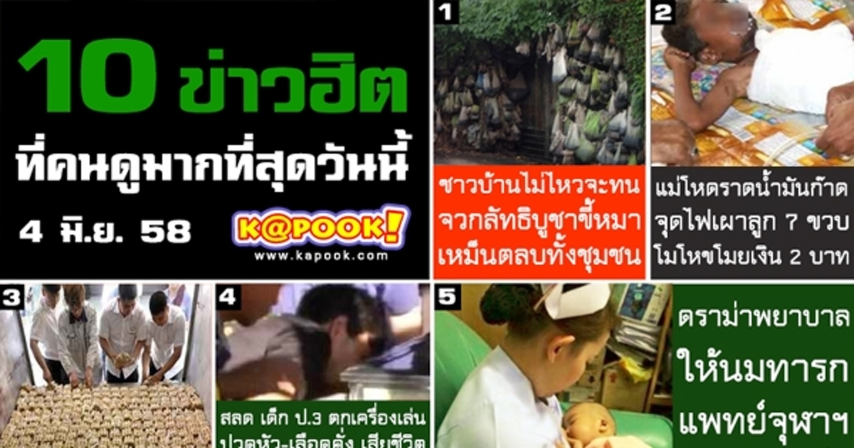 ข่าวฮิตประจำวันนี้ เป็นเรื่องชาวบ้านสุดทนโพสต์เหน็บ ลัทธิบูชาขี้หมา เหม็นตลบทั้งชุมชน รองลงมาเป็นประเด็นสุดสลด แม่โหดราดน้ำมันก๊าด-จุดไฟเผาร่างลูก 7 ขวบ โมโหขโมยเงิน 2 บาท