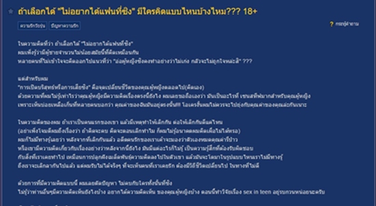 "ในความคิดที่ว่า ถ้าเลือกได้ "ไม่อยากได้แฟนที่ซิง" ผมเพิ่งรู้ว่ามีผู้ชายจำนวนไม่น้อยสมัยนี้ที่คิดเหมือนกัน หลายคนที่ไม่เข้าใจจะคิดออกไปแนวที่ว่า "อ่อผู้หญิงซิงคงทำอย่างว่าไม่เก่ง กลัวจะไม่ถูกใจหล่ะสิ" ???