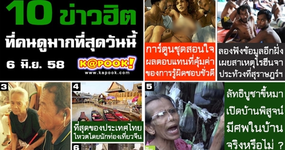 10 ข่าวฮิต ที่มีผู้เข้าชมมากที่สุด ประจำเว็บไซต์ kapook.com วันที่ 6 มิถุนายน 2558 กับประเด็นมาแรง การ์ตูนสอนใจ เรื่องการรู้ผิดชอบชั่วดี และยังมีดราม่าคดีขับรถชนควายตาย กับประเด็นที่น่าสนใจอีกเพียบ ตามไปดูกันเลยค่ะ