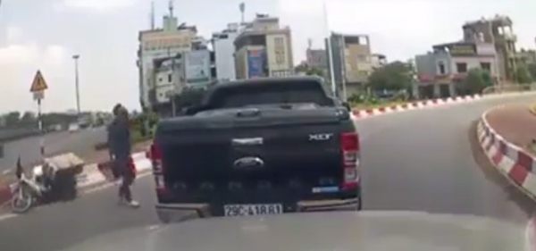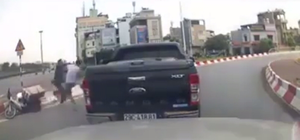 พร้อมกระโดดถีบ ประเคนบาทาสั่งสอนหนุ่มมอเตอร์ไซค์สุดมักง่าย จนล้มโครมไปทั้งรถทั้งคน