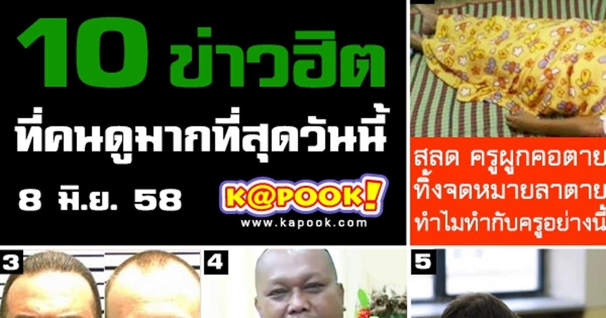 10 ข่าวฮิต ที่มีผู้เข้าชมมากที่สุด ประจำเว็บไซต์ kapook.com วันที่ 7 มิถุนายน 2558 ตามติดกรณี สลด ครูผูกคอตาย ทิ้งจดหมายลาตาย... ทำไมถึงทำกับครูอย่างนี้ รองลวมาคือเป็นเด็น ซวยเลย ISIS เจอบึ้มฐานบัญชาการ หลังโพสต์ภาพเซลฟี่ระบุพิกัด