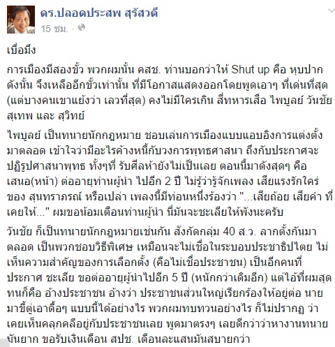 การเมืองมีสองขั้ว พวกผมนั้น คสช. ท่านบอกว่าให้ Shut up คือ หุบปาก ดังนั้น จึงเหลืออีกขั้วเท่านั้น ที่มีโอกาสแสดงออกโดยพูดเอา ๆ ที่เด่นที่สุด (แต่บางคนเขาแย้งว่าเลวที่สุด) คงไม่มีใครเกิน สี่ทหารเสือ ไพบูลย์ วันชัย สุเทพ และ สุวิทย์