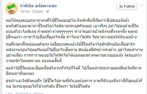 อย่างไรก็ดี ในเวลาต่อมา เฟซบุ๊ก จ่าพิชิต ขจัดพาลชน ก็ออกมากล่าวถึงกระแสการใช้ชีวิตแบบสโลว์ไลฟ์บ้าง โดยระบุว่า...