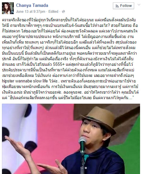 หลังหนุ่มอารมณ์ดี "โน้ส อุดม แต้พานิช" ออกมาเตือนสติวัยรุ่นยุคใหม่ว่า "อย่าเพิ่งมาดัดจริตสโลว์ไลฟ์ เพราะคุณเพิ่งเรียนจบกันมาหมาด ๆ ชีวิตต้องรีบก่อนเลย ต้องขยัน ทำงานหนักก่อน ก่อนที่จะมานั่งชิล ใช้ของแพง ๆ ใช้ของที่ดูเหมือนง่าย" เพียงแค่ข้ามคืนก็มีชาวเน็ตเข้าไปกระหน่ำแชร์ข้อความโดนใจนี้กับเพียบ แถมงานนี้ เมื่อวันที่ 13 มิถุนายน 2558 สาวชัญญ่า ทามาดะ ก็โพสต์ข้อความลงเฟซบุ๊กในเชิงที่เห็นด้วยกับแนวคิดของ โน้ส อุดม จัดว่าเด็ด ! ชัญญ่า ทามาดะ ฝากข้อความถึงน้อง ๆ ฮิปสเตอร์ วันนาบี