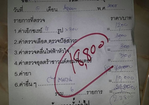 วันที่ 15 มิถุนายน 2558 รายการเรื่องเช้านี้ ทางช่อง 3 รายงานว่า จากกรณีโลกออนไลน์มีการแชร์ต่อ ๆ กันจำนวนมาก เกี่ยวกับภาพใบเสร็จค่ารักษาผู้ป่วยของคลินิกแห่งหนึ่ง ใน อ.สว่างแดนดิน จ.สกลนคร โดยหญิงสาวท่านหนึ่งได้โพสต์ข้อความระบุว่า เมื่อวันที่ 5 มิถุนายนที่ผ่านมา ได้เดินทางไปรักษาอาการป่วยที่คลินิกดังกล่าว ซึ่งยอดค่ารักษารวมแล้วอยู่ที่ 24,800 บาท ทำให้ตัวเธอเกิดข้อสงสัยว่าเหตุใดค่ารักษาถึงได้แพงขนาดนี้ ทั้งที่ตัวเธอเป็นแค่ลมดันในกระเพาะและไขมันในเลือดสูงเท่านั้น อีกอย่างที่เธอรู้สึกติดใจมากคือค่ายา จำนวน 10,000 บาทเลยทีเดียว