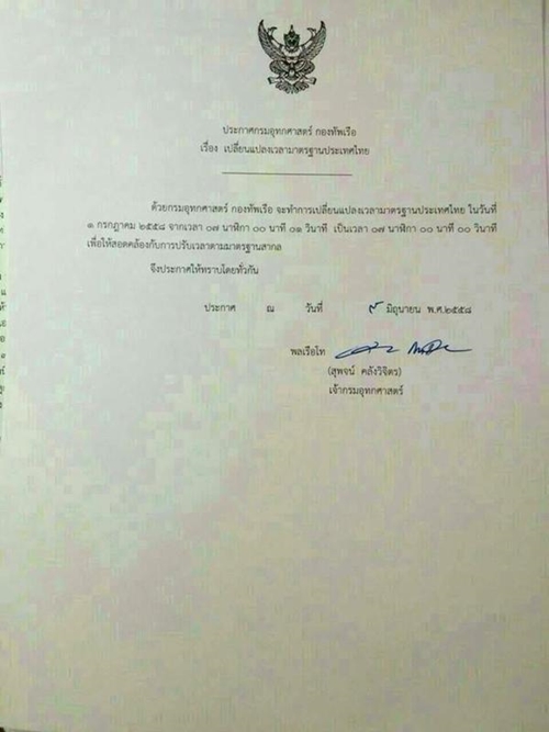 ผู้สื่อข่าวรายงานว่า เมื่อวันที่ 9 มิถุนายน 2558 กรมอุทกศาสตร์ กองทัพเรือ ได้ออกประกาศเรื่อง เปลี่ยนแปลงเวลามาตรฐานประเทศไทย มีใจความว่า