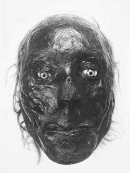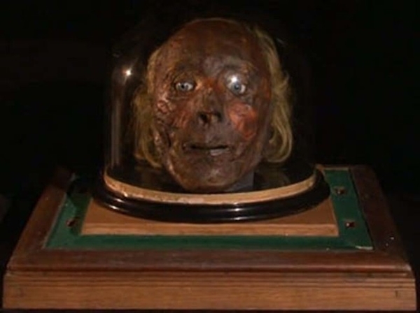 แต่ภาพที่เห็นด้านบนนี้ ที่จริงแตกต่างออกไปจากความต้องการของเบนแธมเล็กน้อย ตรงที่ศีรษะของหุ่นนั้นไม่ใช่หัวจริงๆ ของเขา แต่เป็นหัวขี้ผึ้งที่ถูกปั้นขึ้นมาแทนต่างหาก ส่วนหัวจริง ๆ มีสภาพเป็นเช่นนี้...