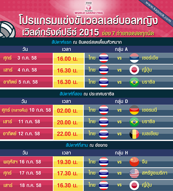 แฟน ๆ วอลเลย์บอลหญิงไทยเตรียมส่งแรงเชียร์อีกครั้ง กับการแข่งขันรายการ เวิลด์กรังด์ปรีซ์ 2015 (WORLD GRAND PRIX 2015) ประเดิมสนามแรกไทยเป็นเจ้าภาพที่อินดอร์ สเตเดียม หัวหมาก ในวันที่ 3 กรกฎาคม 2558 และสำหรับโปรแกรมการแข่งขัน วอลเลย์บอลหญิง เวิลด์กรังด์ปรีซ์ 2015 (WORLD GRAND PRIX 2015) ที่มีการถ่ายทอดสดทางช่อง 7 มีทั้งหมดดังนี้
