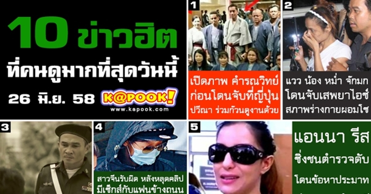 10 ข่าวฮิต ที่มีผู้เข้าชมมากที่สุด ประจำเว็บไซต์ kapook.com วันที่ 26 มิถุนายน 2558 เป็นเรื่อง แอนนา รีส ขับรถชนตำรวจดับ ล่าสุดผลตรวจไม่พบแอลกอฮอล์ รองลงมาเป็นประเด็น แวว จ๊กมก โดนจับยาไอซ์ พบร่างกายผอมโซ หม่ำ กลุ้ม เคยเตือนหลายครั้งแล้ว