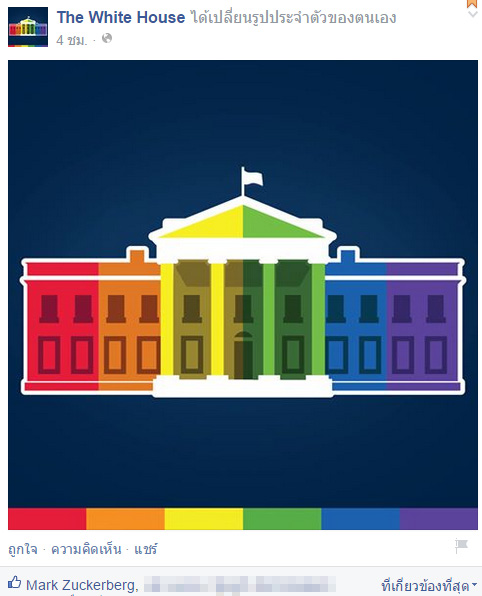 ทาง เฟซบุ๊ก The White House ซึ่งเป็นเฟซบุ๊กทำเนียบขาว ก็ได้มีการเปลี่ยนภาพโปร์ไฟล์เป็นรูปทำเนียบขาวสีรุ้งเช่นเดียวกัน ซึ่งภาพดังกล่าว มาร์ค ซัคเกอร์เบิร์ก ผู้ก่อตั้งเฟซบุ๊ก ก็ได้ร่วมไลค์ภาพนี้ด้วย
