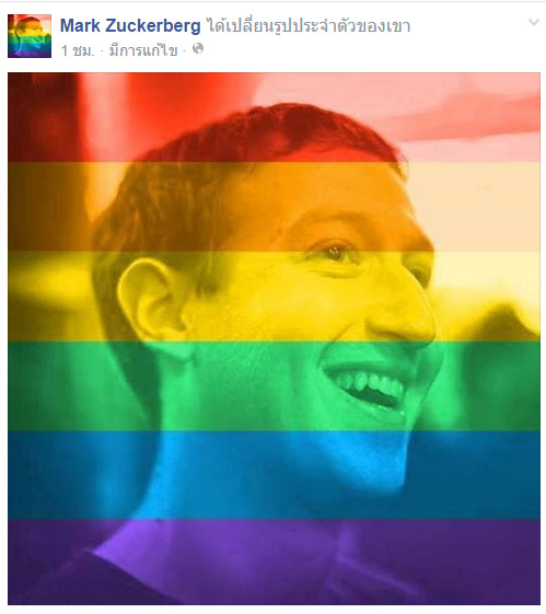 มาที่เฟซบุ๊ก Mark Zuckerberg ก็ได้เปลี่ยนภาพโปรไฟล์เป็นภาพตัวเอง แต่มีลวดลายสีรุ้งคาดเต็มพื้นที่ภาพ
