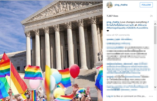 จ๋า ยศสินี โพสต์ว่า Great News... การแต่งงานของคนเพศเดียวกันใช้ได้ทั่วประเทศ ทุกสเตทในอเมริกา... การเดินอันยาวนาน ดีใจกับความรักค่ะ...