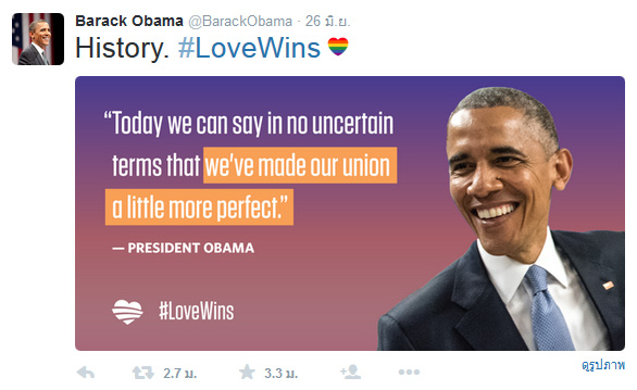 เมื่อวันที่ 27 มิถุนายน 2558 ภายหลังจากที่ศาลฎีกา สหรัฐอเมริกา ตัดสินให้ 50 รัฐในประเทศ อนุญาตให้กลุ่มรักร่วมเพศ สามารถแต่งงานได้อย่างถูกกฎหมาย นำมาซึ่งความปีติยินดี และความปลาบปลื้มใจในหมู่ชาวอเมริกันและคนทั่วโลก จนเกิดแฮชแท็ก #Lovewins และการประดับธงสีรุ้งทั่วไปในโลกออนไลน์ เพื่อเป็นการสนับสนุนคำตัดสินดังกล่าว และร่วมแสดงความยินดี ต่อการยกระดับในเรื่องสิทธิมนุษยชนอีกด้วย