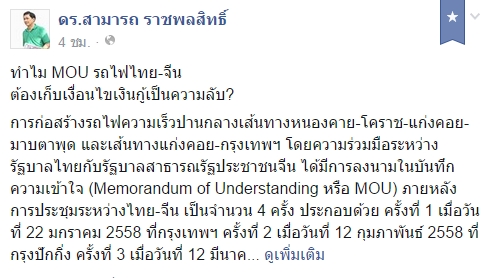 วันที่ 28 มิถุนายน 2558 ผู้สื่อข่าวรายงานว่า นายสามารถ ราชพลสิทธิ์ อดีต ส.ส. ระบบบัญชีรายชื่อ พรรคประชาธิปัตย์ ได้โพสต์ข้อความลงบนเฟซบุ๊กส่วนตัว "ดร.สามารถ ราชพลสิทธิ์" ระบุถึงกรณีการก่อสร้างรถไฟความเร็วปานกลางเส้นทางหนองคาย-โคราช-แก่งคอย-มาบตาพุด และเส้นทางแก่งคอย-กรุงเทพฯ โดยความร่วมมือระหว่างรัฐบาลไทย กับรัฐบาลสาธารณรัฐประชาชนจีน ที่ได้มีการลงนามในบันทึกความเข้าใจ (MOU)