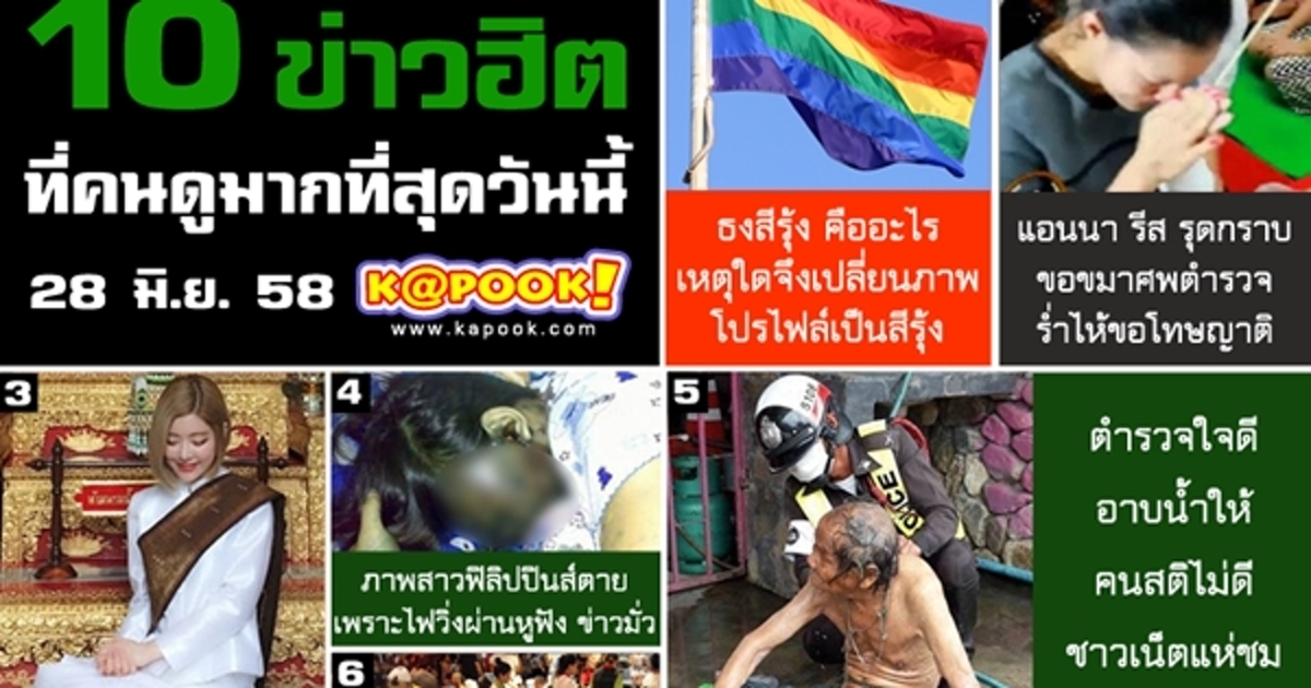 10 ข่าวฮิต ประจำวันที่ 28 มิถุนายน 2558 วันนี้กับโปรไฟล์สีรุ้ง ธงสีรุ้ง มาค้นหาคำตอบว่า มันคืออะไร และเรื่องราวของ แอนนารีส ที่ล่าสุด ได้รุดขอขมาศพ พร้อมกับเรื่องของ ดีเจโซดา ที่มาในมาดกุลสตรี นุ่งขาวห่วมสไบเข้าวัด