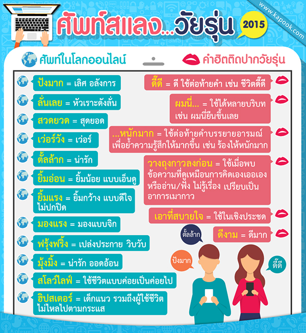 คำฮิตวัยรุ่นฉบับอัพเดท 2015 มาดูกันดีกว่าว่าจะมีศัพท์สแลง และคำเด็ด ๆ อะไรที่ก๊วนโจ๋ออนไลน์นิยมใช้กันบ้าง
