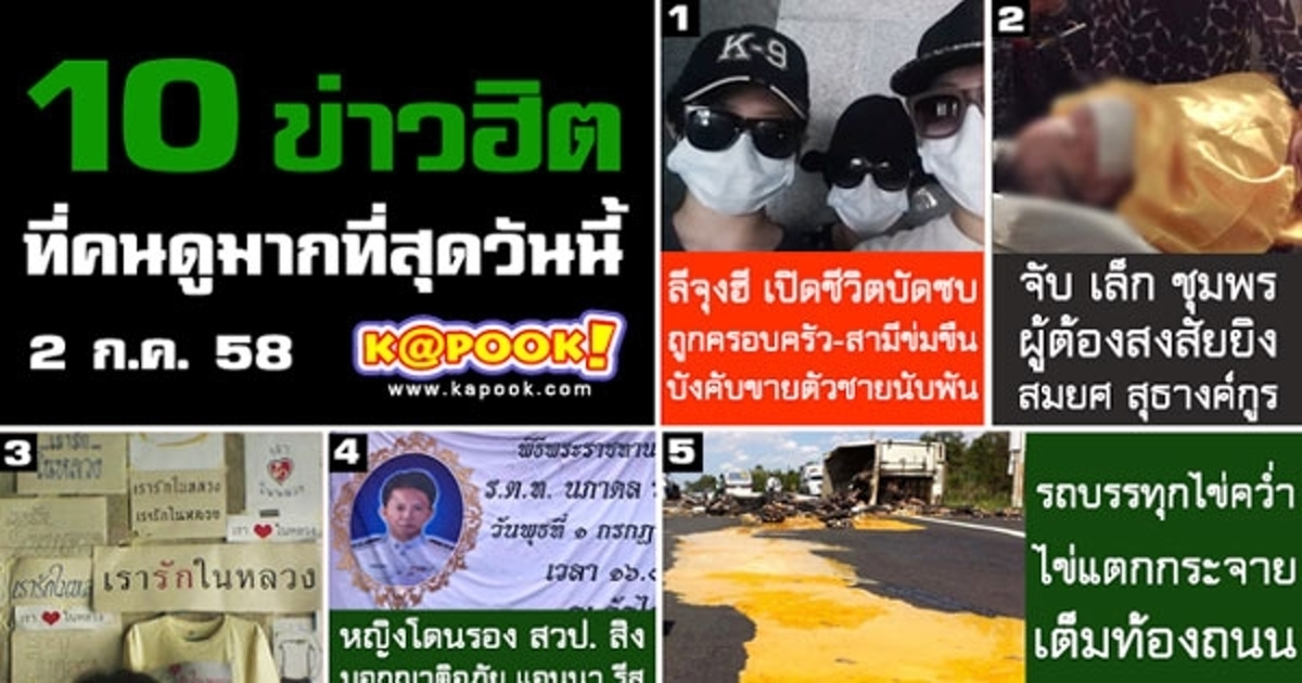 เรื่องที่คนส่วนใหญ่ให้ความสนใจมากที่สุดในวันนี้เป็นเรื่องของ ชีวิตบัดซบ ลี จุง ฮี ถูกครอบครัวตัวเอง-สามีข่มขืน บังคับขายตัวให้ชายนับพัน ตามมาด้วย จับได้แล้ว เล็ก ชุมพร ผู้ต้องสงสัยยิง สมยศ สุธางค์กูร และปิดท้ายกันที่ วินาทีบ้านทลายลงแม่น้ำแม่กลอง เจ้าของโวยเรือชมหิ่งห้อยเป็นเหตุ