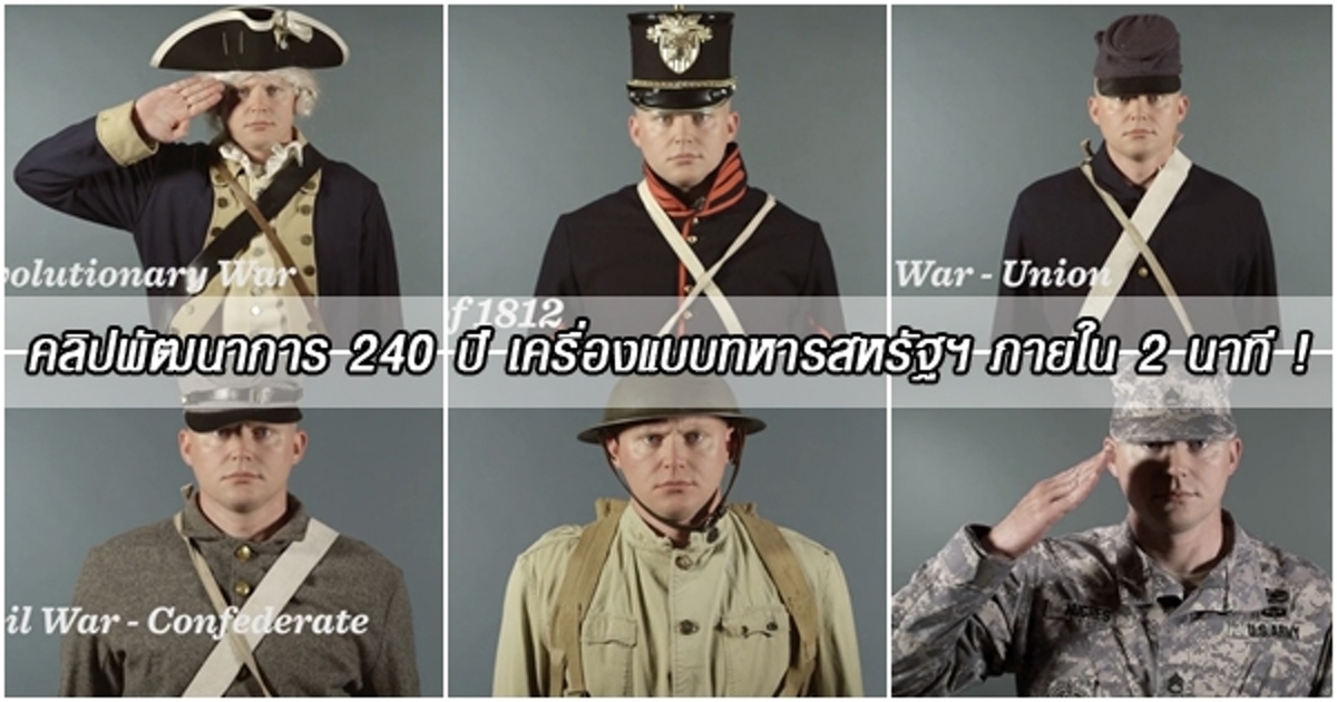 เราจะพาไปดูพัฒนาการเครื่องแบบบรรดารั้วของชาติอเมริกากัน จากคลิป 240 years of Army uniforms in 2 minutes ของ IJReview ที่ย่นย่อประวัติศาสตร์การแต่งตัวของทหารอเมริกันตลอด 240 ปี จากสมัยสงครามยุคต่าง ๆ สรุปให้ดูกันครบถ้วนใน 2 นาที ซึ่งทำขึ้นเนื่องในวาระครบรอบ 240 ปี ก่อตั้งทัพกองทัพสหรัฐฯ ในวันที่ 14 มิถุนายน 2558 นั่นเองครับ