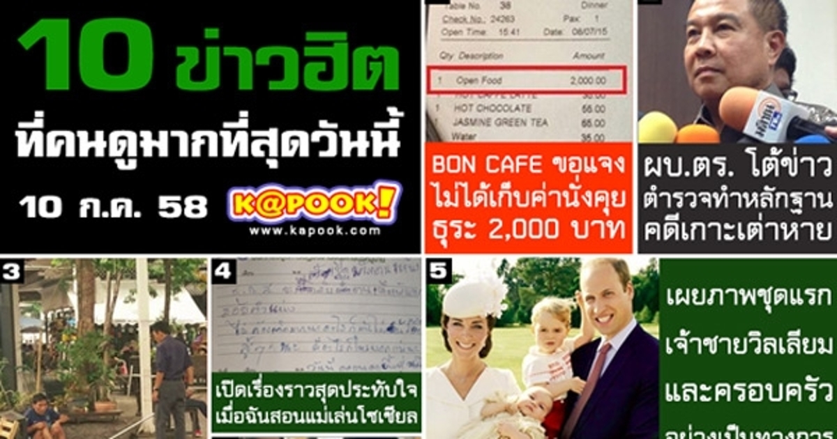 ข่าวฮิตที่คนส่วนใหญ่ให้ความสนใจมากที่สุดในวันนี้เป็นเรื่องของ BON CAFE แจงไม่ได้เก็บค่านั่งคุยธุระ 2,000 บาท ตามมาด้วย ผบ.ตร. โต้ข่าวตำรวจทำหลักฐานคดีเกาะเต่าหาย ยันยังอยู่ครบ และอื่น ๆ อีกมากมาย