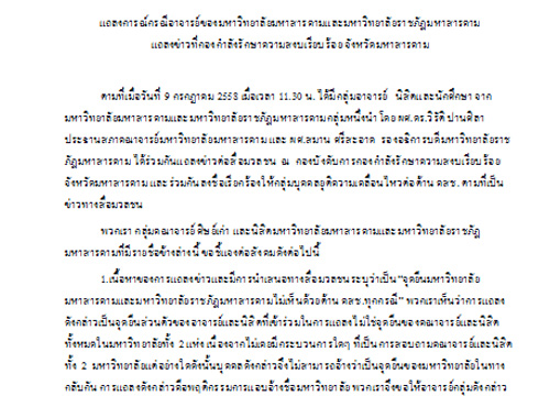 เมื่อวันที่ 10 กรฎาคม 2558 ผู้สื่อข่าวรายงานว่า กลุ่มอาจารย์ นิสิต และนักศึกษาจากมหาวิทยาลัยมหาสารคาม และมหาวิทยาลัยราชภัฏมหาสารคามกลุ่มหนึ่ง นำโดย ผศ. ดร.วิรัติ ปานศิลา ประธานสภาคณาจารย์มหาวิทยาลัยมหาสารคาม และ ผศ.สมาน ศรีสะอาด รองอธิการบดีมหาวิทยาลัยราชภัฏมหาสารคาม ร่วมแถลงข่าว ณ กองบังคับการกองกำลังรักษาความสงบเรียบร้อย จังหวัดมหาสารคาม และร่วมลงชื่อเรียกร้องให้กลุ่มบุคคลที่ออกมาเคลื่อนไหวเพื่อให้ยุติการต่อต้านคณะรักษาความสงบแห่งชาติ (คสช.) โดยขอชี้แจงว่า การแถลงดังกล่าวเป็นจุดยืนส่วนตัวของอาจารย์และนิสิตที่เข้าร่วมในการแถลงไม่ใช่จุดยืนของคณาจารย์และนิสิตทั้งหมดในมหาวิทยาลัยทั้ง 2 แห่ง