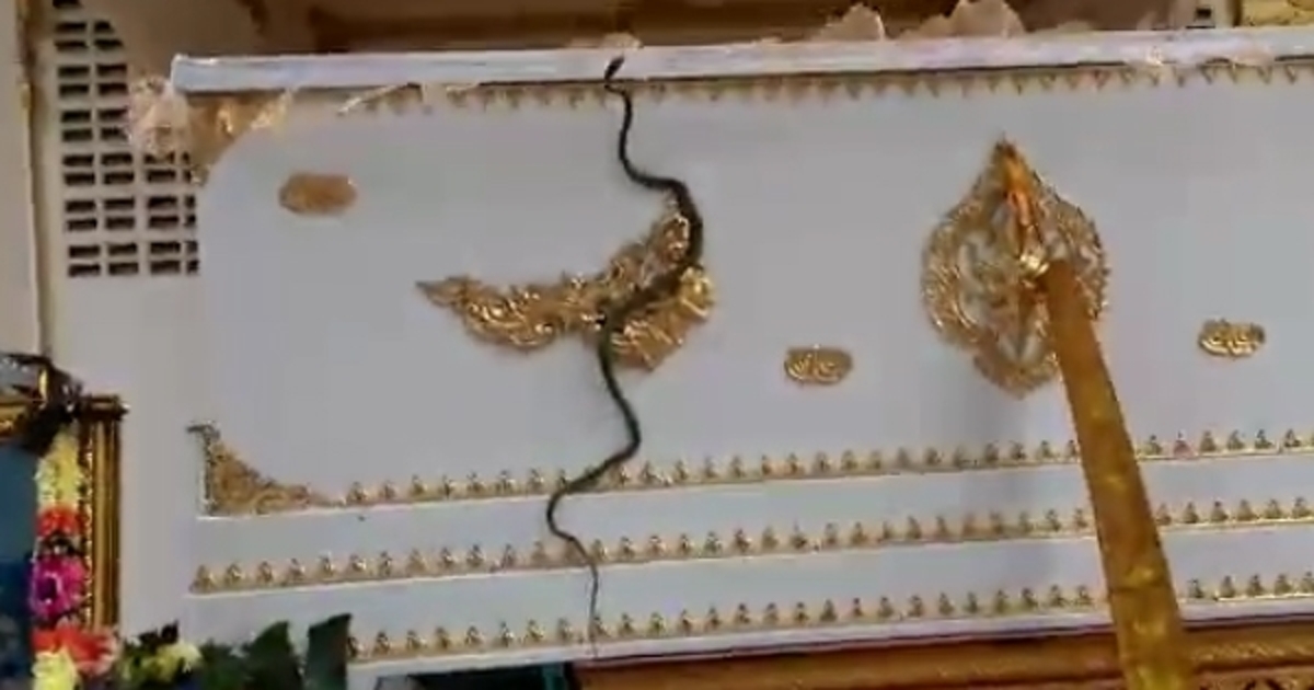 ชาวเน็ตแชร์คลิปชวนขนลุก งูตัวยาวเลื้อยขึ้นโลงศพที่ตั้งอยู่บนเมรุ ขณะทำพิธีฌาปนกิจ ไม่ยอมไปไหน