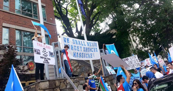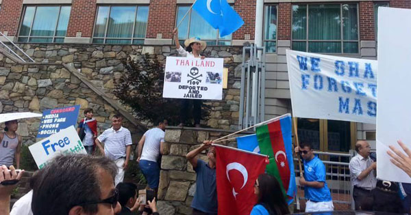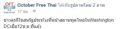 เมื่อวันที่ 13 กรกฎาคม 2558 ผู้สื่อข่าวรายงานว่า ที่เพจเฟซบุ๊ก October Free Thai ได้เผยแพร่ภาพเหตุการณ์หน้าสถานทูตเอกอัครราชทูตไทยประจำกรุงวอชิงตัน ดีซี ประเทศสหรัฐอเมริกา โดยอ้างว่า มีกลุ่มผู้ชุมนุมชาวตุรกีส่วนหนึ่งได้ออกมาประท้วงทางการไทย ในการจัดการเกี่ยวกับปัญหาชาวอพยพลี้ภัยชาวอุยกูร์ ที่ได้ส่งตัวชาวอุยกูร์ไปประเทศจีนประมาณ 109 คน เมื่อวันที่ 12 กรกฎาคมที่ผ่านมา