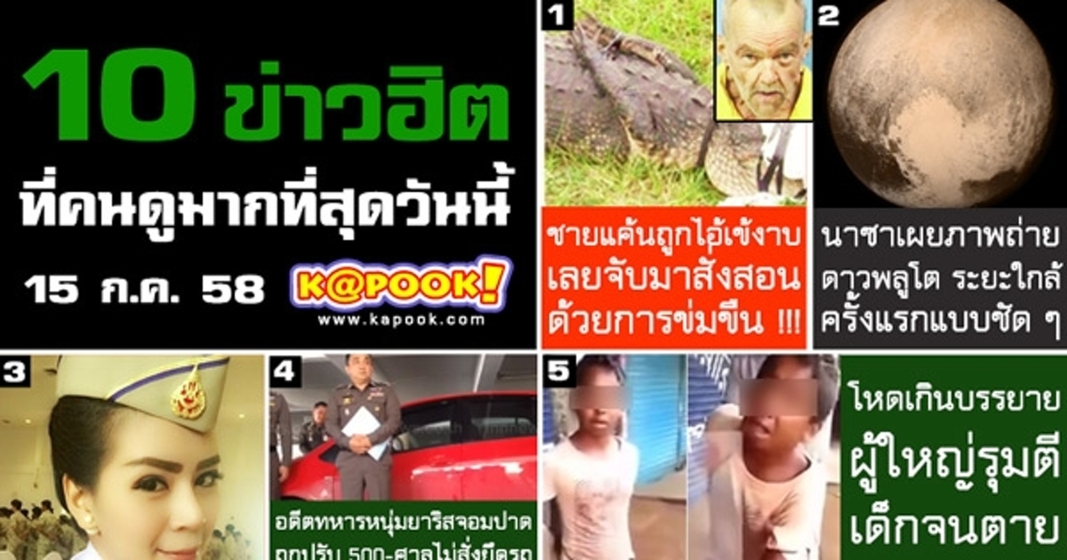 ข่าวฮิตที่คนให้ความสนใจมากที่สุดในวันนี้เริ่มด้วยที่ ชายสุดแค้น ไอ้เข้จะงาบลงน้ำ เลยจับมาสั่งสอนด้วยการข่มขืน ตามมาด้วย นาซา เผยภาพถ่าย ดาวพลูโต ระยะใกล้ครั้งแรกแบบชัด ๆ และอื่น ๆ อีกมากมาย