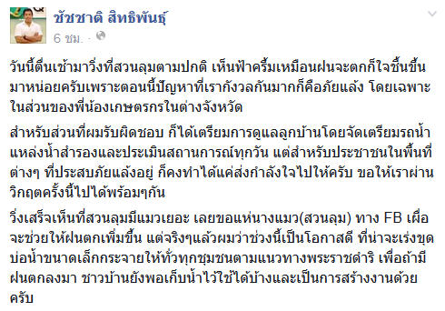 ซึ่งล่าสุด (16 กรกฎาคม 2558) นายชัชชาติ สิทธิพันธุ์ อดีตรัฐมนตรีว่าการกระทรวงคมนาคม ได้โพสต์ข้อความลงบนเฟซบุ๊กส่วนตัว "ชัชชาติ สิทธิพันธุ์" ถึงภาวะวิกฤตภัยแล้งที่เกิดขึ้นในประเทศ โดยระบุว่า ปัญหาที่คนกังวลเป็นอย่างมากในขณะนี้คงหนีไม่พ้นปัญหาภัยแล้ง เมื่อเช้าตนมาออกกำลังกายที่สวนลุมพินี เห็นแมวหลายตัวเลยคิดว่าน่าจะเอาแมวเหล่านั้นมาแห่ขอฝน เผื่อจะช่วยให้ฝนตกมากขึ้น