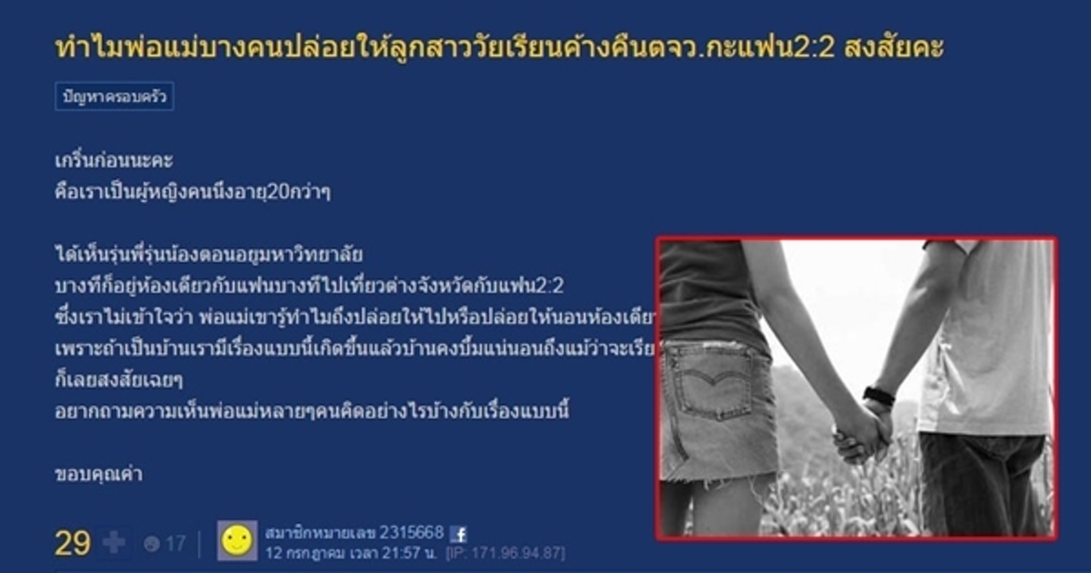 กระทู้ฮิต จี๊ดใจพ่อแม่ คิดอย่างไรถึงปล่อยให้ลูกสาว นอนค้างต่างจังหวัดกะผู้ชายสองต่อสอง หรือพักหอเดียวกับแฟน