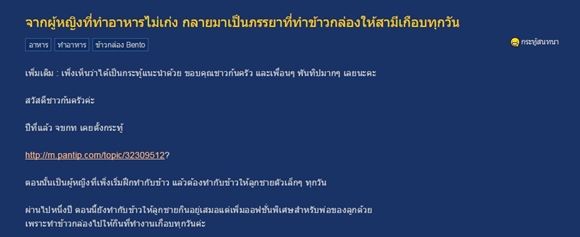 นอกจากนี้ยังมีแม่บ้านหลายรายที่ก่อนหน้านี้ทำอาหารไม่ค่อยเป็น แต่พยายามเรียนรู้จนเริ่มทำอาหารเป็น เข้ามาแชร์เรื่องราวของตน เช่น "จากทำอะไรไม่เป็นนอกจากเมนูไข่ แต่พอมีแฟน ตอนนี้เริ่มตามรอย จขกท. แล้วค่ะ เราไม่ได้ทำข้าวกล่อง แต่เป็นทำอาหารเย็นให้แฟนทานแทน จนคุณชายเธอร้องแต่จะกินข้าวฝีมือเรา บอกว่าไปกินข้างนอกไม่อร่อย อิอิ แต่บางทีก็หิวไม่เป็นเวล่ำเวลาค่ะ (แอบเคือง แต่ก็ลุกมาทำให้นะ เกือบเที่ยงคืน) ดีใจเนอะเวลาทำถูกใจเค้า แต่ก็มีนอยด์นะเวลาทำไม่อร่อย ปนๆกันไป 555"