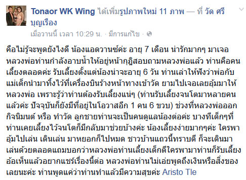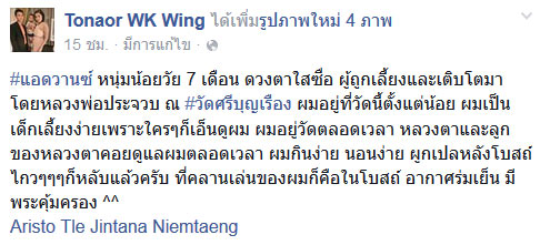 โดยเฟซบุ๊กคุณ Tonaor WK Wing ได้โพสต์ภาพและเรื่องราว เล่าให้ฟังว่า เด็กชายคนนี้ชื่อ น้องแอดวานซ์ อายุ 7 เดือน หลวงพ่อบอกว่าพ่อกับแม่ของเด็กมาทิ้งไว้ที่เครื่องบินร้างหน้าทางเข้าวัดศรีบุญเรือง อายุของหนูน้อยคนนี้น่าจะแค่ 6 วันเท่านั้น หลวงพ่อบอกว่ามีความสุขที่ได้เลี้ยงน้อง ส่วนน้องแอดวานซ์ก็เลี้ยงง่าย ไกวเปลแป๊บเดียวก็หลับ คลานเล่นในโบสถ์ คนที่ผ่านไปผ่านมาก็คอยมาเล่นด้วย