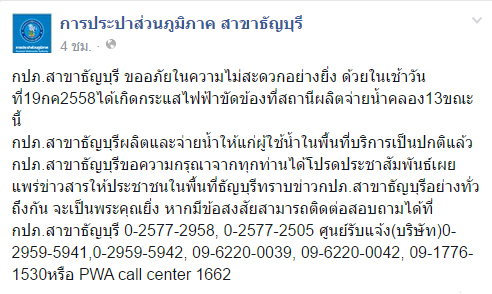 จากสถานการณ์น้ำในช่วงเวลาที่ประสบกับภาวะแล้งนี้ หนึ่งในกลุ่มผู้ที่ได้รับผลกระทบเป็นอย่างมากเห็นจะหนีไม่พ้นชาวบ้านผู้อาศัยอยู่ในพื้นที่จังหวัดปทุมธานี ซึ่งได้รับการจ่ายน้ำจากการประปาส่วนภูมิภาค สาขาธัญบุรี โดยทางเฟซบุ๊กของ การประปาส่วนภูมิภาค สาขาธัญบุรี ก็ได้มีการแจ้งความคืบหน้าในการผลิตน้ำมาโดยตลอด ทั้งในช่วงเวลาที่น้ำดิบในคลองระพีพัฒน์แห้งขอดจนไม่สามารถผลิตน้ำประปาได้ สลับกับความคืบหน้าในการจัดสรรน้ำมาผลิตน้ำประปาแก่ประชาชน