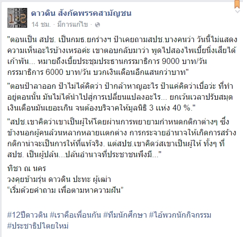 วันที่ 20 กรกฎาคม 2558 ผู้สื่อข่าวรายงานว่า เพจเฟซบุ๊ก ดาวดิน สังกัดพรรคสามัญชน ได้โพสต์รูปและข้อความโดยอ้างว่าเป็นของ นางทิชา ณ นคร อดีตสมาชิกสภาปฏิรูปแห่งชาติ (สปช.) และกรรมาธิการยกร่างรัฐธรรมนูญ ที่ตัดสินใจลาออกจากตำแหน่งดังกล่าวเมื่อวันที่ 1 มีนาคม 2558 ซึ่งระบุว่า ตอนที่ตนลาออกไม่ได้กล้าหาญแต่อย่างใด แต่ตนเองนั้นรู้สึกเบื่อกับการทำงาน เพราะคิดว่าไม่ได้ทำให้อะไรเปลี่ยนแปลงเลย สปช. พยายามกำหนดกติกาต่าง ๆ แต่ความจริงแล้วการกระจายอำนาจเพื่อสร้างกติกาน่าจะเป็นอำนาจที่แท้จริง แต่ สปช. คิดว่าตัวเองเป็นผู้ให้ ทั้งที่ สปช. เป็นผู้ปล้นอำนาจจากประชาชนที่พึงมี