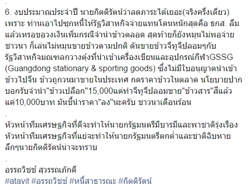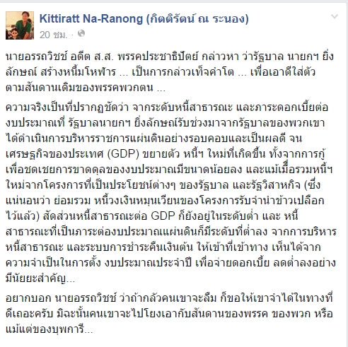 ดูแล้วศึกครั้งนี้คงจบลงไม่ง่าย สำหรับกรณีการออกมากล่าวหาว่า "รัฐบาล น.ส.ยิ่งลักษณ์ ได้สร้างหนี้สาธารณะมโหฬาร" ของนายอรรถวิชช์ สุวรรณภักดี อดีต ส.ส. พรรคประชาธิปัตย์ โดยเมื่อวานนี้ (20 กรกฎาคม 2558) ผู้สื่อข่าวรายงานว่า นายกิตติรัตน์ ณ ระนอง อดีตรองนายกรัฐมนตรี ในรัฐบาล น.ส.ยิ่งลักษณ์ ชินวัตร อดีตนายกรัฐมนตรี ได้โพสต์ข้อความลงบนเฟซบุ๊กส่วนตัว Kittiratt Na-Ranong (กิตติรัตน์ ณ ระนอง) ตอบโต้กรณีดังกล่าวว่า นายอรรถวิชช์ ได้กล่าวเท็จคำโต เพราะตอนที่รัฐบาล น.ส.ยิ่งลักษณ์ ได้เข้ามาดำเนินการและรับช่วงจากรัฐบาลพรรคประชาธิปัตย์ ได้บริหารราชการอย่างรอบคอบ จนเศรษฐกิจของประเทศ (GDP) ขยายตัว สัดส่วนหนี้สาธารณะต่อ GDP ก็อยู่ในระดับต่ำ และหนี้สาธารณะที่เป็นภาระงบประมาณก็มีระดับต่ำลง