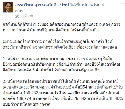 โดยในวันนี้ (21 กรกฎาคม 2558) นายอรรถวิชช์ ก็ได้โพสต์ข้อความลงบนเฟซบุ๊กส่วนตัว อรรถวิชช์ สุวรรณภักดี - ปชป ชี้แจงในกรณีที่ นายกิตติรัตน์ ณ ระนอง ได้กล่าวหาว่า นายอรรถวิชช์ เป็นพวกพูดโกหกคำโตว่า ตนไม่แปลกใจเลยว่าทำไม นายกิตติรัตน์ ถึงได้ฉายาว่า "โกหกสีขาว" เพราะชอบพูดความจริงแค่ครึ่งเดียว ทั้งนี้หนี้สาธารณะของแผ่นดิน ตัวเลขของกระทรวงการคลังระบุชัดสิ้นปี 2554 ขณะที่ น.ส.ยิ่งลักษณ์ เข้ารับตำแหน่งคือ 4.2 ล้านล้านบาท และปี 2556 ในเวลาที่ น.ส.ยิ่งลักษณ์ พ้นจากตำแหน่งกลับเพิ่มขึ้นเป็น 5.4 ล้านล้านบาท เพิ่มขึ้น 1.2 ล้านล้านบาท ในช่วงรัฐบาลเดียว