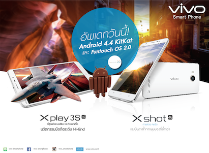 vivo Service (Thailand) Co., Ltd. มีการอัพเดทระบบ Android และ Funtouch OS ให้แก่สมาร์ทโฟน vivo Xplay3S และ vivo Xshot โดยทั้ง 2 รุ่นนั้นจะทำการอัพเดทระบบจาก Android 4.3 Jelly Bean เป็น Android 4.4.2 Kitkat และ Funtouch OS 1.0/1.2 เป็น Funtouch OS 2.0 ตามลำดับ