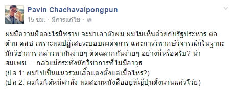 ล่าสุดนาย ปวิน ชัชวาลพงศ์พันธ์ อ.มหาวิทยาลัยโตเกียว ประเทศญี่ปุ่น ได้โพสต์ข้อความลงบนเฟซบุ๊กส่วนตัว "Pavin Chachavalpongpun" ระบุว่า ตนเองผิดอะไรมิทราบ แค่ไม่เห็นด้วยกับรัฐประหาร และตนไม่เคยหนีคำสั่ง คสช. แต่ตนเองมาสอนหนังสือที่ญี่ปุ่นนานแล้ว