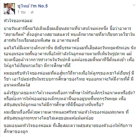 วันที่ 25 กรกฎาคม 2558 ผู้สื่อข่าวรายงานว่า นายชูวิทย์ กมลวิศิษฎ์ หัวหน้าพรรครักประเทศไทย ได้โพสต์ข้อความลงบนเฟซบุ๊กส่วนตัว "ชูวิทย์ I'm No.5" ระบุถึงการศึกษาไทยว่า ตนยอมรับในหัวใจของคนเป็นพ่อแม่ ที่มานั่งเฝ้าลูกหลานนั่งเรียนกวดวิชา เพื่อเอาไปแข่งขันในระบบการศึกษาไทย จบออกมาจะได้ทำงานที่ดี ตนอยากอถามว่ารัฐบาลได้วางแผนการศึกษาให้กับเด็กในอนาคตหรือยัง หรือต้องการให้พ่อแม่ของเด็กเหล่านี้มานั่งรอบนพื้นทุก ๆ วันหยุด เพื่อสนับสนุนให้มีการศึกษาที่ดีขึ้นเท่านั้นหรือ