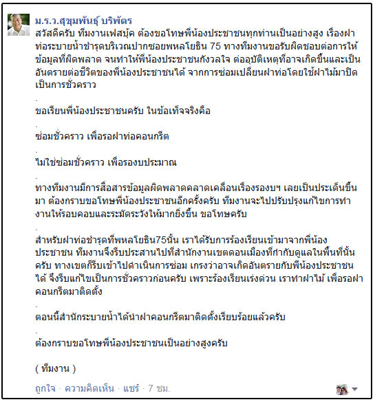ถูกวิพากษ์วิจารณ์หนาหูกลายเป็นดราม่ายามดึกไปเมื่อวานนี้ (31 กรกฎาคม 2558) จากกรณีที่เพจ ม.ร.ว.สุขุมพันธุ์ บริพัตร ของผู้ว่าฯ กทม. ได้โพสต์ภาพการซ่อมฝาท่อระบายน้ำชำรุดแบบชั่วคราว ที่หน้าซอยพหลโยธิน 75 ด้วยการนำท่อนไม้มาตีปิดไว้เป็นการชั่วคราว เพื่อรอวัสดุอุปกรณ์ที่ใช้หมดก่อนปีงบประมาณ นำมาทำการซ่อมเป็นการถาวรอีกครั้ง