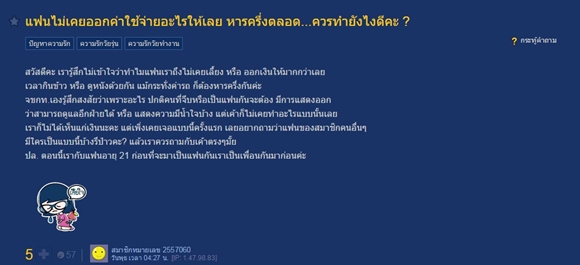 "สวัสดีคะ เรารู้สึกไม่เข้าใจว่าทำไมแฟนเราถึงไม่เคยเลี้ยง หรือ ออกเงินให้มากกว่าเลย เวลากินข้าว หรือ ดูหนังด้วยกัน แม้กระทั่งค่ารถ ก็ต้องหารครึ่งกันค่ะ จขกท.เองรู้สึกสงสัยว่าเพราะอะไร ปกติคนที่จีบหรือเป็นแฟนกันจะต้อง มีการแสดงออก ว่าสามารถดูแลอีกฝ่ายได้ หรือ แสดงความมีน้ำใจบ้าง แต่เค้าก็ไม่เคยทำอะไรแบบนั้นเลย เราก็ไม่ได้เห็นแก่เงินนะคะ แต่เพิ่งเคยเจอแบบนี้ครั้งแรก เลยอยากถามว่าแฟนของสมาชิกคนอื่นๆ มีใครเป็นแบบนี้บ้างรึป่าวคะ? แล้วเราควรถามกับเค้าตรงๆมั้ย ปล. ตอนนี้เรากับแฟนอายุ 21 ก่อนที่จะมาเป็นแฟนกันเราเป็นเพื่อนกันมาก่อนค่ะ"