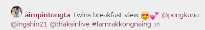 ล่าสุด น.ส.พินทองทา ได้โพสต์ภาพผ่านอินสตาแกรมส่วนตัว aimpintongta ขณะที่ พ.ต.ท. ทักษิณ ได้นั่งหัวโต๊ะร่วมรับประทานอาหารกับน้อง "เอมิ-นานิ" หลานสาวฝาแฝด พร้อมระบุข้อความว่า "Twins breakfast view"