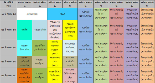 1. การแสดงทางศิลปวัฒนธรรม ทั้งการแสดงศิลปวัฒนธรรมพื้นบ้าน และร่วมสมัยตั้งแต่วันที่ ๑๙ - ๒๓ สิงหาคม ๒๕๕๘ ตั้งแต่เวลา ๑๓.๐๐ ๒๐.๐๐ น. ณ ลานพาร์ค พารากอน เช่น