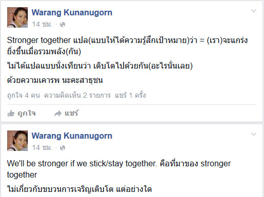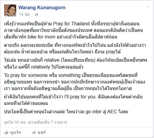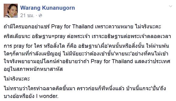 ล่าสุด คุณวรางค์ คุณานุกร อดีตอาจารย์ประจำภาควิชาภาษาอังกฤษ คณะอักษรศาสตร์ จุฬาลงกรณ์มหาวิทยาลัย ได้โพสต์ข้อความแสดงความคิดเรื่องดังกล่าวผ่านเฟซบุ๊กส่วนตัว Warang Kunanugorn ระบุว่า จริง ๆ แล้วคำว่า #prayforthailand เป็นคำที่เหมาะสมกับสถานการณ์ในขณะนี้เป็นที่สุด เพราะคำว่า Pray for Thailand หมายถึงการอธิษฐานเพื่อให้คนนั้นสามารถผ่านพ้นสิ่งที่กำลังเผชิญอยู่ไปได้
