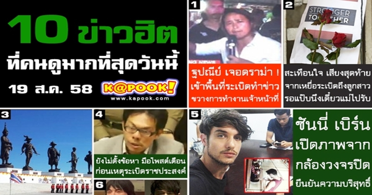 ข่าวฮิตประจำวันที่ 19 สิงหาคม 2558 กับข่าวฐปณีย์ เจอดราม่า เข้าพื้นที่ระเบิดรายงานข่าว ขัดขวางการทำงานเจ้าหน้าที่ และข่าวสุดสะเทือนใจ เสียงสุดท้ายจากเหยื่อระเบิดถึงลูกสาว "รอแป๊บนึงเดี๋ยวแม่ไปรับ"