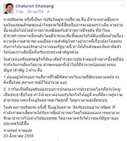 วันที่ 20 สิงหาคม 2558 ผู้สื่อข่าวรายงานว่า นายจาตุรนต์ ฉายแสง แกนนำพรรคเพื่อไทย ได้โพสต์ข้อความลงบนเฟซบุ๊กส่วนตัว "Chaturon Chaisang" ระบุถึงกระแสข่าวการปรับคณะรัฐมนตรี (ครม.) ในรัฐบาล พล.อ. ประยุทธ์ จันทร์โอชา นายกรัฐมนตรีและหัวหน้าคณะรักษาความสงบแห่งชาติ (คสช.) ที่มีรายชื่อการปรับย้ายบางส่วนเล็ดลอดออกมาในสื่อหลายสำนักว่า การปรับ ครม. ครั้งนี้มีรายชื่อจำนวนมาก แต่โดยรวมไม่ได้ดีขึ้น หรืออาจจะแย่ลงกว่าเดิมด้วยซ้ำ เพราะมีชื่อของข้าราชการเกษียณ และข้าราชการปัจจุบันที่นำโดยข้าราชการทหารเป็นหลัก และไม่ได้สับเปลี่ยนด้วยเรื่องของความรู้ความสามารถ แต่เป็นเรื่องของการรักษาอำนาจโดยตรงของรัฐบาลชุดนี้