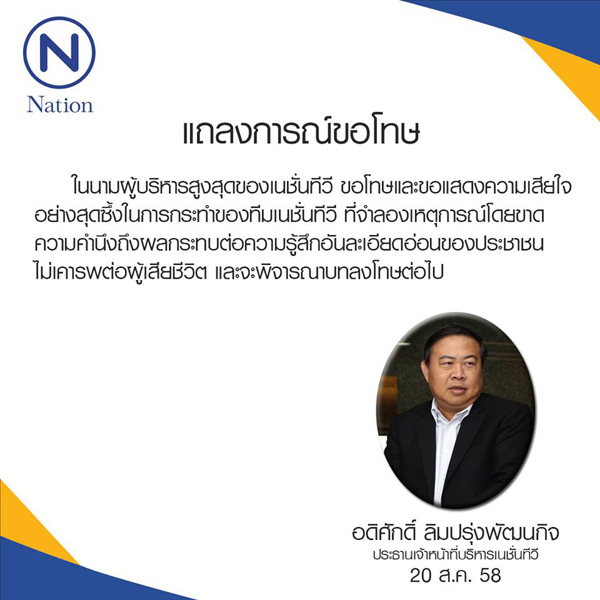 ขอโทษและขอแสดงความเสียใจอย่างสุดซึ้งในการกระทำของทีมเนชั่นทีวี ที่จำลองเหตุการณ์โดยขาดความคำนึงถึงผลกระทบต่อความรู้สึกอันละเอียดอ่อนของประชาชน ไม่เคารพต่อผู้เสียชีวิต และจะพิจารณาบทลงโทษต่อไป