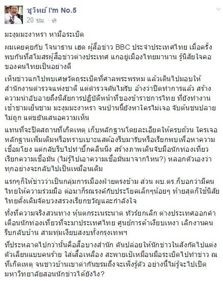 โดยข้อความในเฟซบุ๊กของนายชูวิทย์ ชูวิทย์ I'm No.5 มีรายละเอียดดังนี้